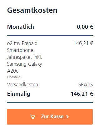 Bei o2 gibt es ein nettes Prepaid-Bundle. Dort gibt es das Samsung Galaxy A20e mit einem vorausbezahlten Prepaid Vertrag für 146,21€. (Vergleichspreis: ~230€ inkl. Tarif) Ersparnis ~84€