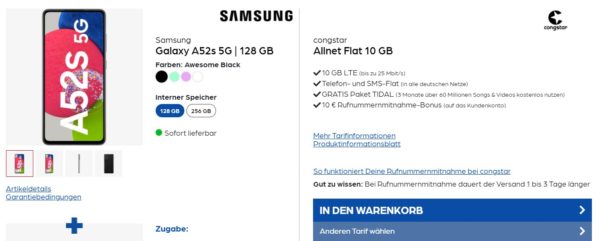 Fazit: Hier bekommt ihr das Samsung Galaxy A52s 5G (128GB) + Google Nest Hub 2. Gen + 10 GB LTE + Alles-Flat für effektiv nur 2,57€/Monat