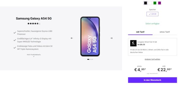 Samsung Galaxy A54 5G + 44GB LTE + Alles-Flat im Telekom-Netz für 22€/Monat – eff. 7,91€/Monat