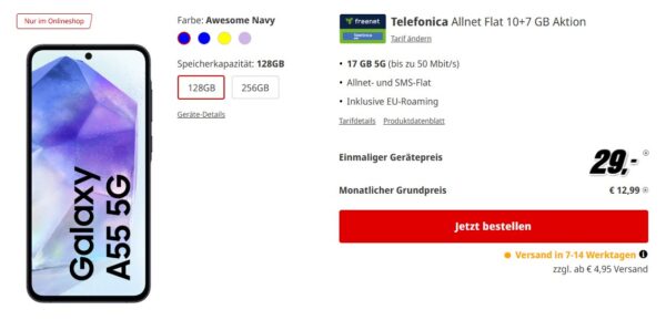 Neues Angebot von MediaMarkt, dort bekommt ihr das Samsung Galaxy A55 + 17GB 5G + Alles-Flat im o2-Netz für 12,99€/Monat