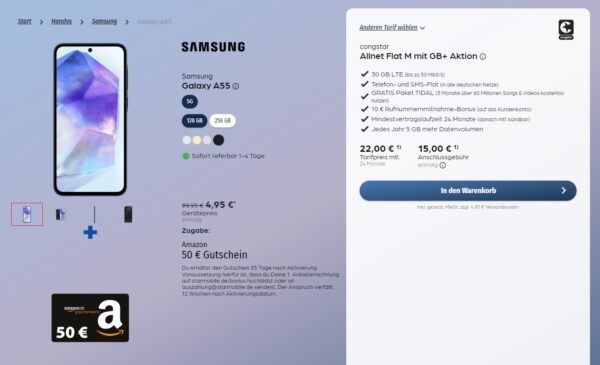 Nice, bei Starmobile bekommt ihr das Samsung Galaxy A55 + 30GB LTE + Alles-Flat im Telekom-Netz + 50€ Amazon Gutschein* für 22€/Monat