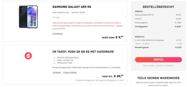 Nice bei HIGH-Mobile bekommt ihr das Samsung Galaxy A55 5G + 28GB LTE/5G + Alles-Flat im Telekom-Netz für 25€/Monat