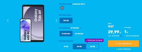 Im Onlineshop von Blau bekommt ihr zum Wochenstart das Samsung Galaxy A55 + Galaxy Tab A9 + 25GB/5G + Alles-Flat im o2-Netz für 29,99€/Monat
