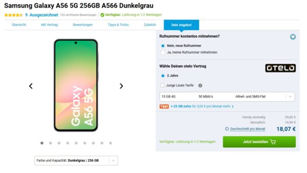 Wenn es ein neues Smartphone inkl. Tarif sein darf und es nicht unbedingt 5G sein muss, könnt ihr euch bei Gomibo nun das passende Angebot sichern, dort bekommt ihr das Samsung Galaxy A56 5G 256GB + 15GB 4G + Alles-Flat im Vodafone-Netz für 14,99€/Monat
