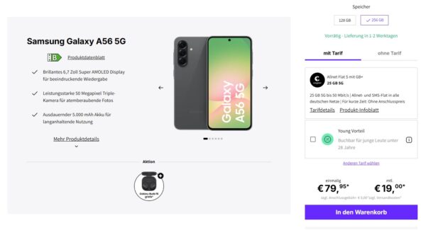Neuer Deal von DeinHandy, dort bekommt ihr das Samsung Galaxy A56 5G + Buds FE + 25GB 5G + Alles-Flat im Telekom-Netz für 19€/Monat