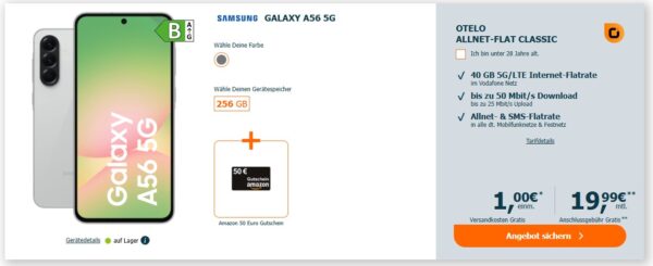 Samsung Galaxy A56 5G + 50€ Amazon Gutschein* + 40GB 5G + Alles-Flat im Vodafone-Netz für 19,99€/Monat – eff. 3,82€/Monat