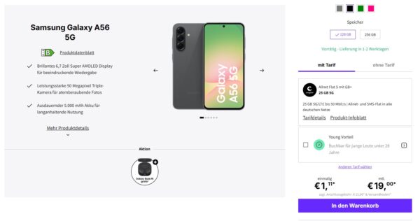 Samsung Galaxy A56 5G inkl. Galaxy Buds FE + 25GB 5G + Alles-Flat im Telekom-Netz für 19€/Monat – eff. 4,73€/Monat