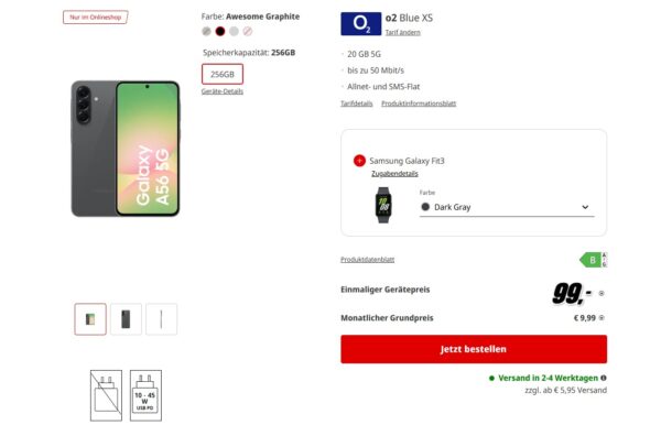 Neuer Deal seitens MediaMarkt, dort bekommt ihr das Samsung Galaxy A56 + Galaxy Fit3 + 20GB 5G + Alles-Flat im o2-Netz für 9,99€/Monat