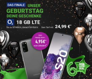 Und weil wir gerade dabei sind. Samsung Galaxy S20 gesucht inkl. Tarif? Bei DeinHandy bekommt ihr als Geburtstags-Deal das Samsung Galaxy S20 + 18 GB LTE + Alles-Flat im o2-Netz für 24,99€/Monat.