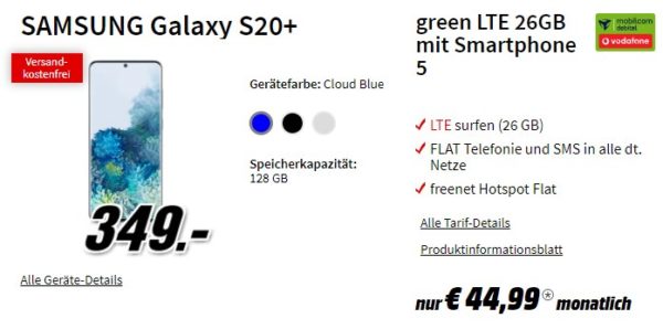 Und gleich noch ein Tarif mit dem Samsung Galaxy S20+ Plus hinterher, bei MediaMarkt bekommt ihr das Samsung Galaxy S20+ Plus inkl. 26GB LTE + Alles-Flat + Hotspot-Flat + Galaxy Buds im Vodafone-Netz für 44,99€/Monat