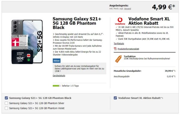 *TOP* Samsung Galaxy S21+ 5G 128 GB + 30GB LTE + Alles-Flat im Vodafone-Netz für 39,99€/Monat – Effektiv 1,91€/Monat + 100€ Bonus für RNM