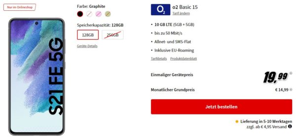 Samsung Galaxy S21 FE 5G + 10GB LTE + Alles-Flat im o2-Netz für 14,99€/Monat – eff. 1,07€/Monat