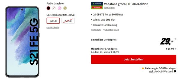 Samsung Galaxy S21 FE 5G + 20GB LTE + Alles-Flat im Vodafone-Netz für 15,99€/Monat – eff. 2,45€/Monat