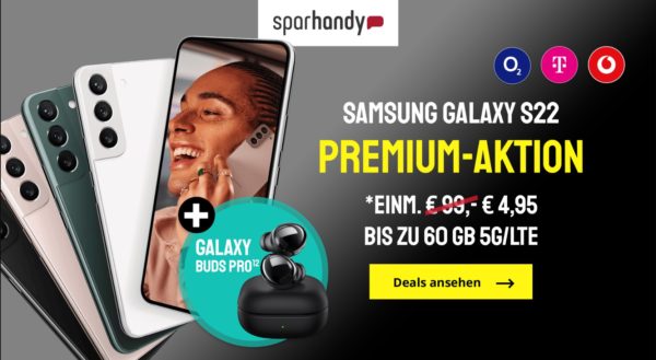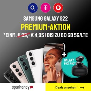 Bei Sparhandy bekommt ihr das Samsung Galaxy S22 + 25GB + Alles-Flat im Vodafone-Netz für 39,99€/Monat + gratis Galaxy Buds Pro