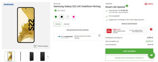 Samsung Galaxy S22 + 25GB LTE + Alles-Flat im Vodafone-Netz für 34,99€/Monat
