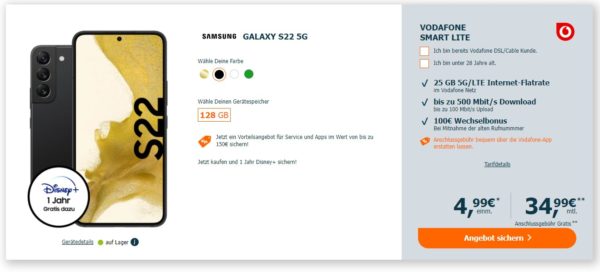 Samsung Galaxy S22 5G + 25GB LTE + Alles-Flat im Vodafone-Netz für 34,99€/Monat – Eff. 4,62€/Monat