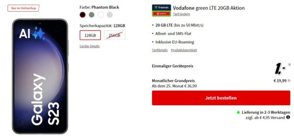 Samsung Galaxy S23 5G + 20GB LTE + Alles-Flat im VF-Netz für 19,99€/Monat – eff. 0,18€/Monat // 10GB für 17,99€/Monat