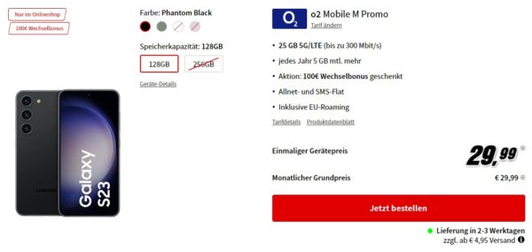 Sehr schönes Angebot von MediaMarkt, dort bekommt ihr das Samsung Galaxy S23 5G + 25GB LTE + Alles-Flat im o2-Netz für 29,99€/Monat