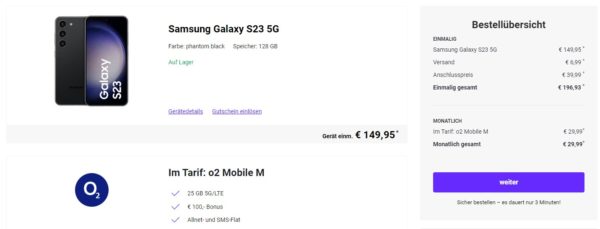 Schönes Angebot seitens DeinHandy, dort bekommt ihr das Samsung Galaxy S23 5G + 25GB LTE + Alles-Flat im o2-Netz für 29,99€/Monat