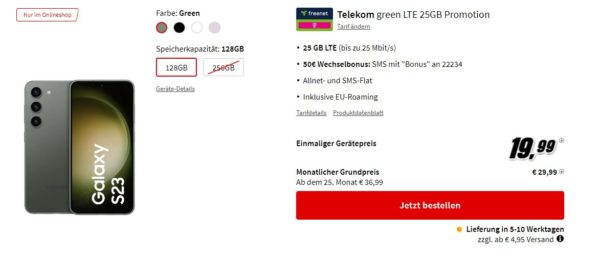 Schönes Angebot seitens sMediaMarkt mit dem Samsung Galaxy S23, dort bekommt ihr das Samsung Galaxy S23 5G + 25GB LTE + Alles-Flat im Telekom-Netz für 29,99€/Monat