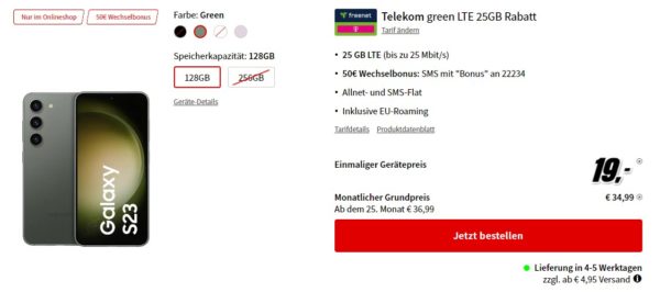 Samsung Galaxy S23 5G + 25GB LTE + Alles-Flat im Telekom-Netz für 34,99€/Monat – eff. 7,28€/Monat