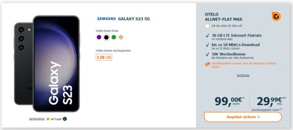Samsung Galaxy S23 5G + 30 GB LTE + Alles-Flat im Vodafone-Netz für 29,99€/Monat – eff. 3,53€/Monat
