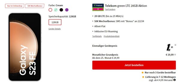 *TOP* Samsung Galaxy S23 FE + 20GB LTE + Alles-Flat im Telekom-Netz für 19,99€/Monat – eff. 0,03€/Monat