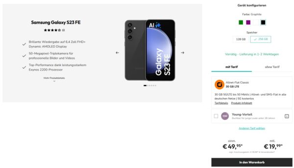 Samsung Galaxy S23 FE + 30GB 5G + Alles-Flat im VF-Netz für 19,99€/Monat – eff. 2,36€/Monat dank 50€ Bonus