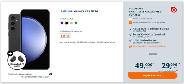 Samsung Galaxy S23 FE 5G + Buds FE + 35GB LTE + Alles-Flat im Vodafone-Netz für 34,99€/Monat – eff. 4,53€/Monat