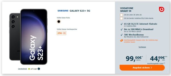 Samsung Galaxy S23+ inkl. 65GB LTE + Alles-Flat im Vodafone-Netz für 44,99€/Monat – eff. 9,78€/Monat