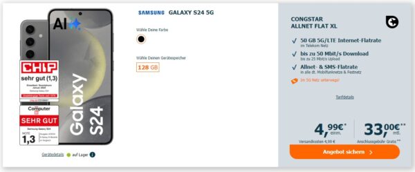 Samsung Galaxy S24 5G + 50GB LTE/5G + Alles-Flat im Telekom-Netz für 33€/Monat – eff. 9,46€/Monat