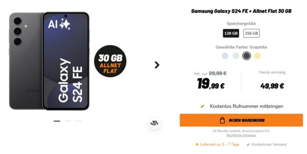Samsung Galaxy S24 FE + 30GB LTE + Allnet-Flat im VF-Netz für 19,99€/Monat – eff. 0,06€/Monat