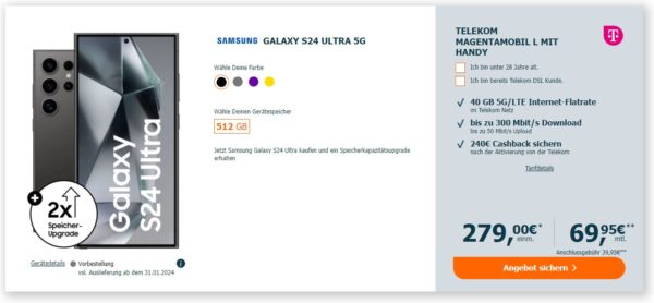 Samsung Galaxy S24 Ultra 512GB 5G + 40GB LTE + Alles-Flat im Telekom-Netz für 69,95€ + 240€ Cashback
