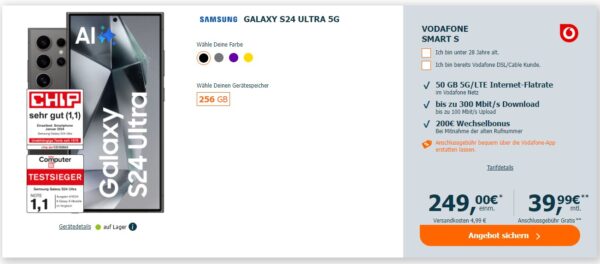 Samsung Galaxy S24 Ultra 5G + 50GB LTE + Alles-Flat im VF-Netz für 39,99€/Monat – eff. 1,45€/Monat + 200€ Bonus