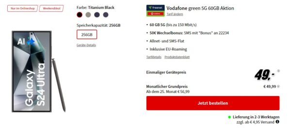 Als Weekend-Deal bekommt ihr im Onlineshop von MediaMarkt das Samsung Galaxy S24 Ultra + 60GB LTE + Alles-Flat im Vodafone-Netz für 49,99€/Monat