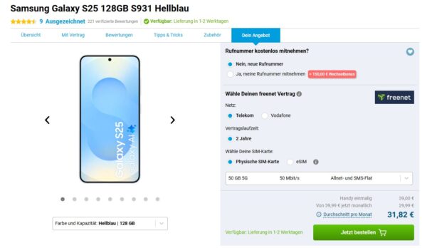 Samsung Galaxy S25 128GB + 50GB 5G + Alles-Flat im Telekom-Netz für 29,99€/Monat – eff. 0,24€/Monat