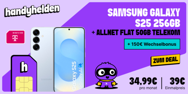 Bei Handyhelden könnt ihr euch gerade das Samsung Galaxy S25 256GB + 50GB 5G + Alles-Flat im Telekom-Netz für 34,99€/Monat sichern