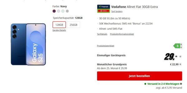 Samsung Galaxy S25 + 30GB 5G + Alles-Flat im Vodafone-Netz für 22,99€/Monat – eff. 1,53€/Monat