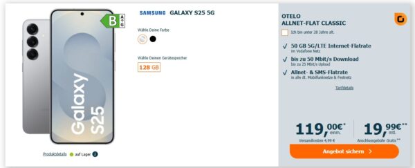 Samsung Galaxy S25 5G 128GB + 50GB 5G + Alles-Flat im Vodafone-Netz für 19,99€/Monat – eff. 0,95€/Monat