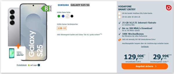 Samsung Galaxy S25 5G + Galaxy Tab A11 + 25GB 5G + Alles-Flat im Vodafone-Netz für 29,99€/Monat – eff. 0,77€/Monat