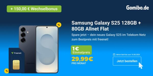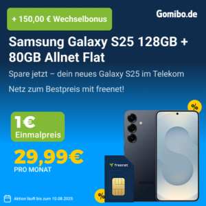 Nice, ihr sucht das Galaxy S25 inkl. Tarif mit ordentlich GB? Bei Gomibo bekommt ihr das Samsung Galaxy S25 + 80GB 5G Alles-Flat im Telekom-Netz für 29,99€/Monat