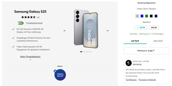 - Im Aktionszeitraum vom 06.10.2025 bis 01.11.2025 ein Samsung Galaxy S25 | S25 FE in deinem Wunschtarif auf dieser Seite auswählen und zum ausgewiesenen Preis bestellen.