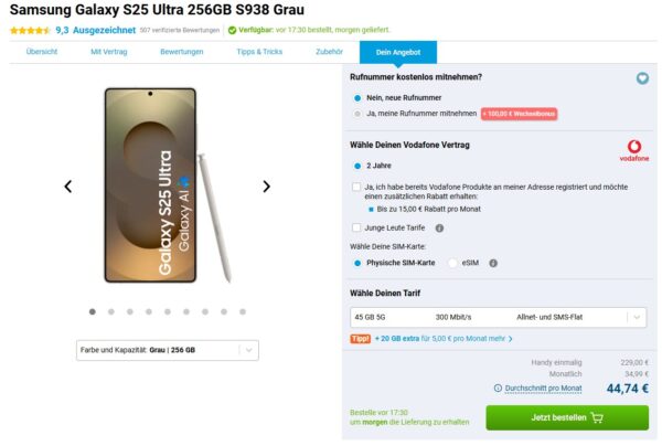 Samsung Galaxy S25 Ultra 256GB + 45GB 5G + Alles-Flat im Vodafone-Netz für 34,99€/Monat – eff. 4,20€/Monat