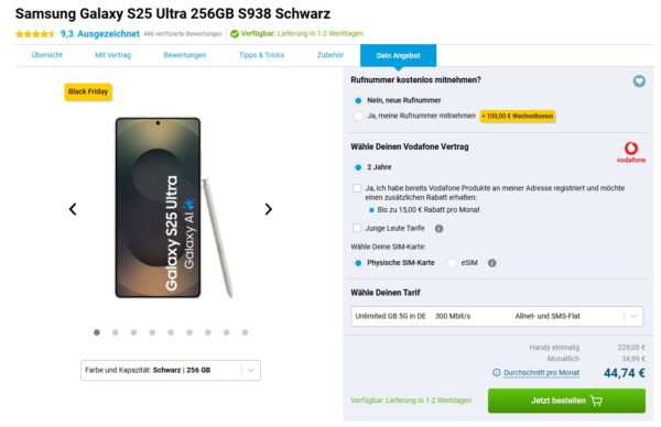 Samsung Galaxy S25 Ultra 256GB + Unlimited GB 5G + Alles-Flat im Vodafone-Netz für 34,99€/Monat – eff. 3,11€/Monat