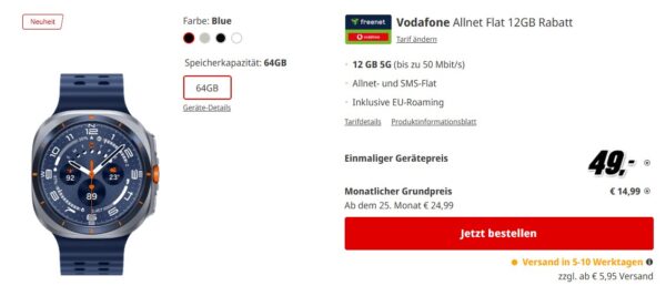 Ihr benötigt kein Smartphone und hättet lieber eine Watch inkl. Tarif, perfekt, bei MediaMarkt bekommt ihr die Samsung Galaxy Watch Ultra (2025) LTE + 12GB 5G + Alles-Flat im Vodafone-Netz für 14,99€/Monat