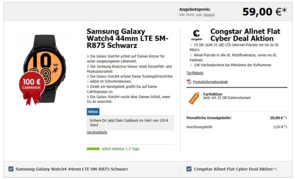 Samsung Galaxy Watch4 44mm LTE SM-R875 + Congstar Cyber Deal Aktion (25 GB LTE + Alles-Flat im Telekom-Netz) für 20€/Monat – Effektiv 5,34€/Monat