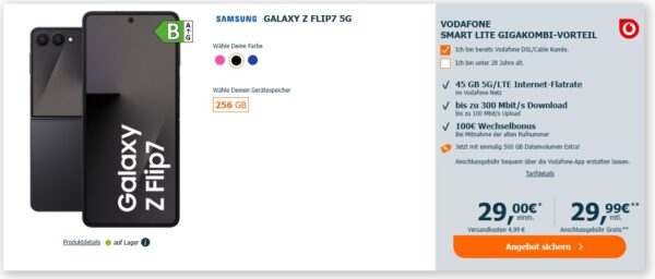 Samsung Galaxy Z Flip7 5G (256GB) + 35GB 5G + Alles-Flat im Vodafone-Netz für 34,99€/Monat – eff. 0,37€/Monat
