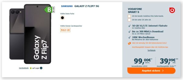 Samsung Galaxy Z Flip7 5G + 50GB 5G + Alles-Flat im Vodafone-Netz für 39,99€/Monat – eff. 2,45€/Monat
