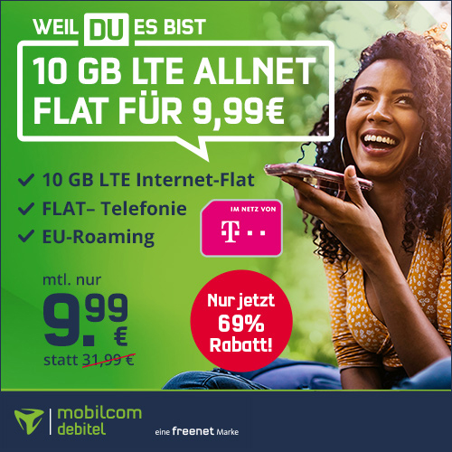Bei Mobilcom Debitel LogiTel gibt es nur für kurze Zeit wieder den Telekom-Knaller vom BlackFriday! Satte 10 GB Telekom LTE AllnetFlat für nur 9,99€/Monat!