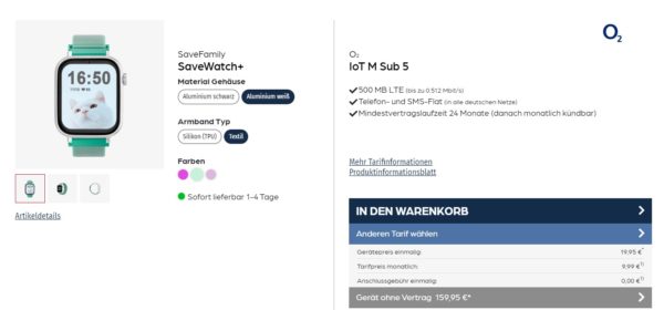Schönes Angebot von Starmobile, dort bekommt ihr die SaveWatch+ inkl. 500 MB LTE + Alles-Flat im o2-Netz für 9,99€/Monat